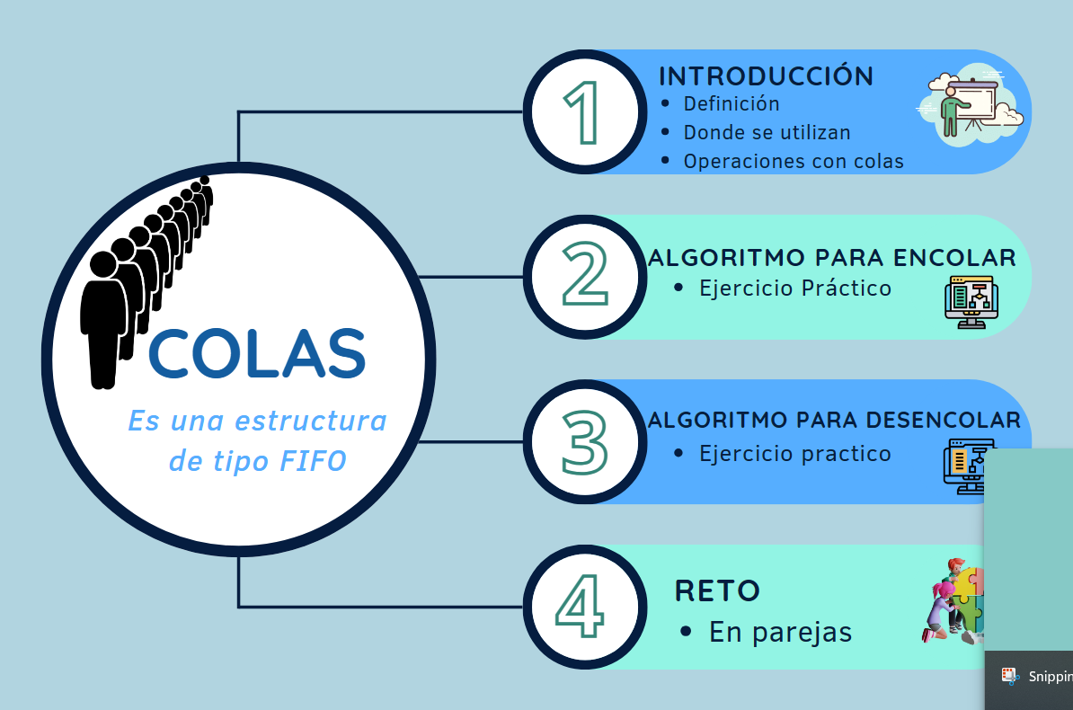 Una cola es una lista ordenada en la cual las operaciones de inserción se efectúan en un extremo llamado último y las operaciones de borrado se efectúan en el otro extremo llamado primero. Es una estructura FIFO (First Input First Output) primero en entrar primero en salir.